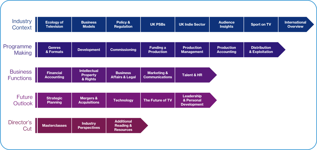 The syllabus covers every element of the TV & Streaming Media ecosystem. It is made up of four streams: Industry Context, Programme Making, Business Functions and Future Outlook. Each of these streams cover core topics ranging from: how a programme is developed, commissioned and made, to how money flows within the industry and how the UK TV sector is likely to change within the next five to ten years.